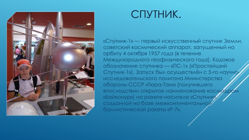 «Спу́тник-1» — первый искусственный спутник Земли, советский космический аппарат, запущенный