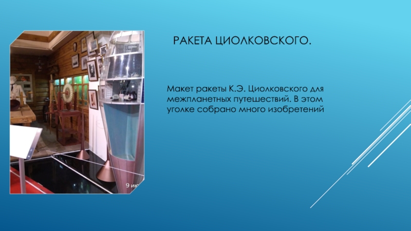 Макет ракеты К.Э. Циолковского для межпланетных путешествий. В этом