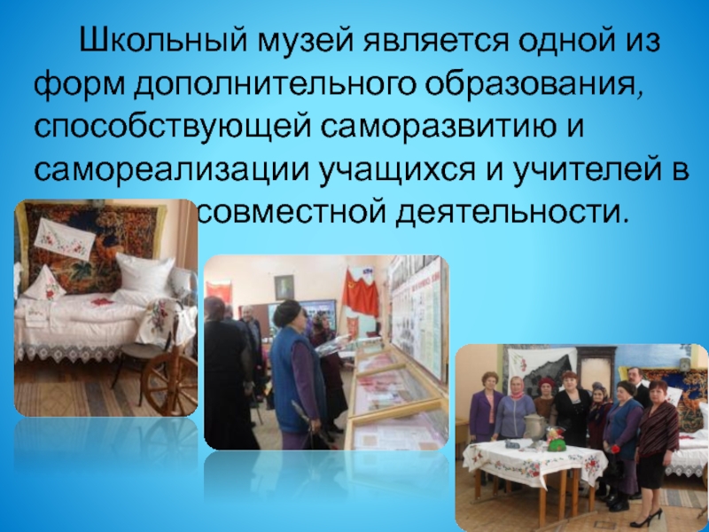 Слайд 5 Школьный музей является одной из форм дополнительного образования, способствующей саморазвитию