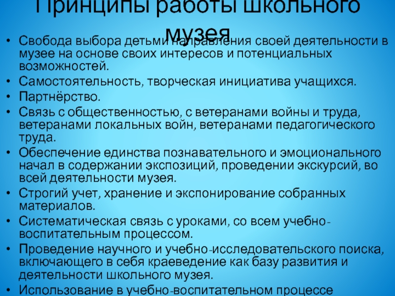 Обеспечение единства познавательного и эмоционального начал в содержании экспозиций, проведении экскурсий, во всей деятельности музея.