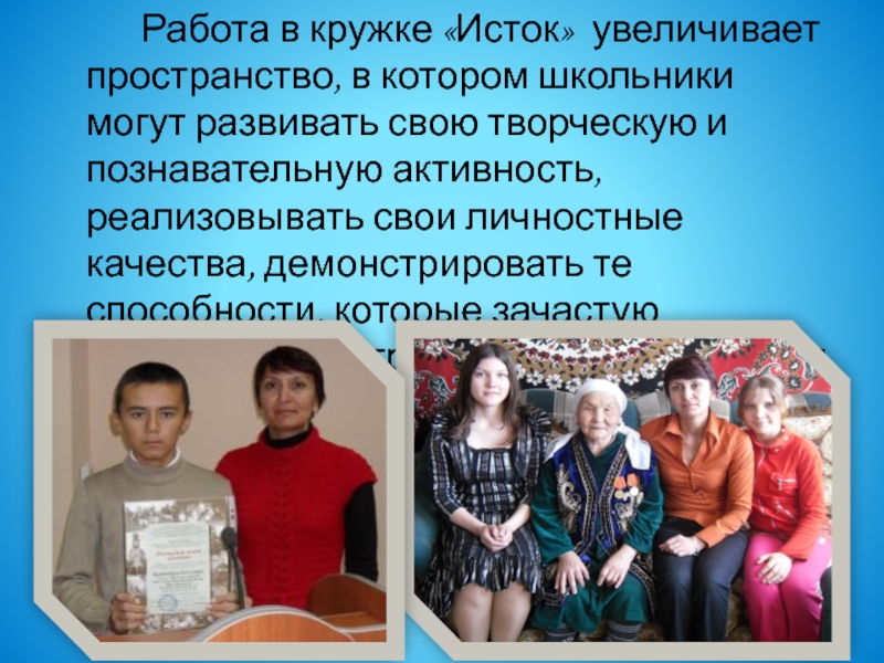 Слайд 7 Работа в кружке «Исток» увеличивает пространство, в котором школьники могут