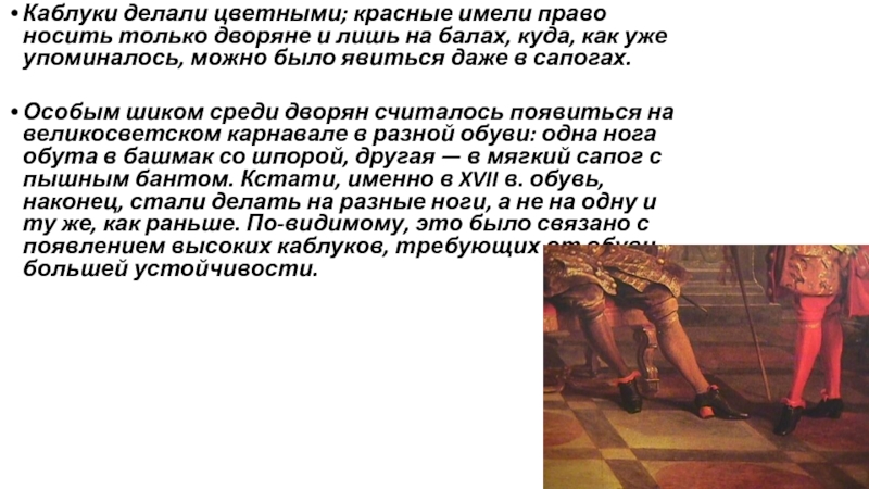 Слайд 6Каблуки делали цветными; красные имели право носить только дворяне и