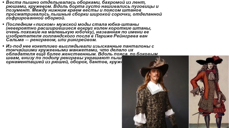 Из-под нее кокетливо выглядывали изысканные панталоны с тончайшими кружевными манжетами, что делало их обладателя ещё более женственным. Вдоль пояса, по боковым швам, внизу по подолу ренгравы украшают пышной лепной орнаментацией из рюшей, оборок, бантов, кружев.
