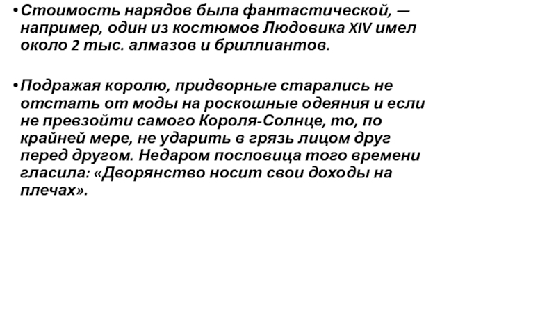 Слайд 2Стоимость нарядов была фантастической, — например, один из костюмов Людовика