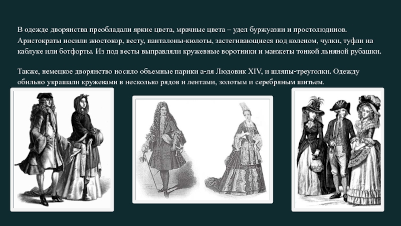 коленом, чулки, туфли на каблуке или ботфорты. Из под весты выправляли кружевные воротники и манжеты тонкой льняной рубашки.Также, немецкое дворянство носило объемные парики а-ля Людовик XIV, и шляпы-треуголки. Одежду обильно украшали кружевами в несколько рядов и лентами, золотым и серебряным шитьем.