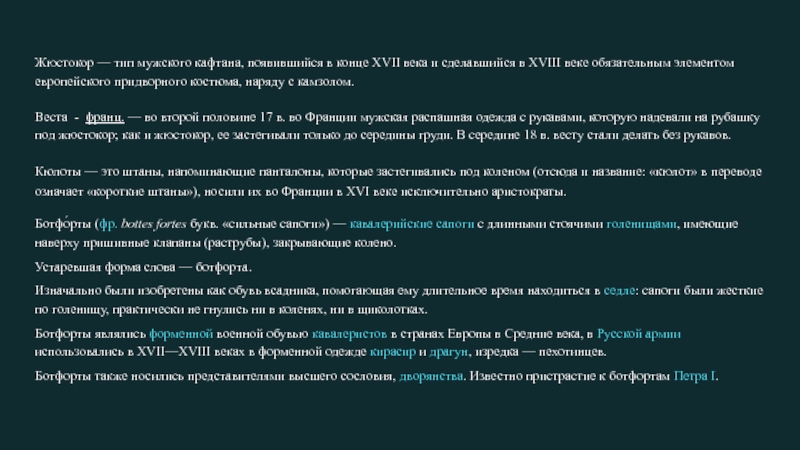 буржуазии и простолюдинов. Аристократы носили жюстокор, весту, панталоны-кюлоты, застегивающиеся под