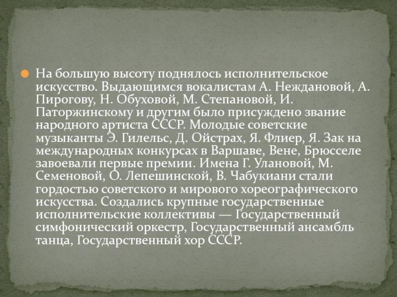 было присуждено звание народного артиста СССР. Молодые советские музыканты Э. Гилельс, Д. Ойстрах, Я. Флиер, Я. Зак на международных конкурсах в Варшаве, Вене, Брюсселе завоевали первые премии. Имена Г. Улановой, М. Семеновой, О. Лепешинской, В. Чабукиани стали гордостью советского и мирового хореографического искусства. Создались крупные государственные исполнительские коллективы — Государственный симфонический оркестр, Государственный ансамбль танца, Государственный хор СССР.