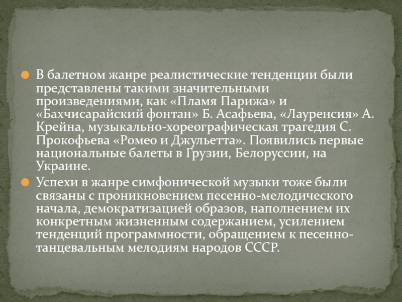 Слайд 9В балетном жанре реалистические тенденции были представлены такими значительными произведениями,