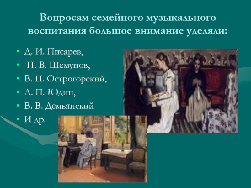 Слайд 13Вопросам семейного музыкального воспитания большое внимание уделяли: