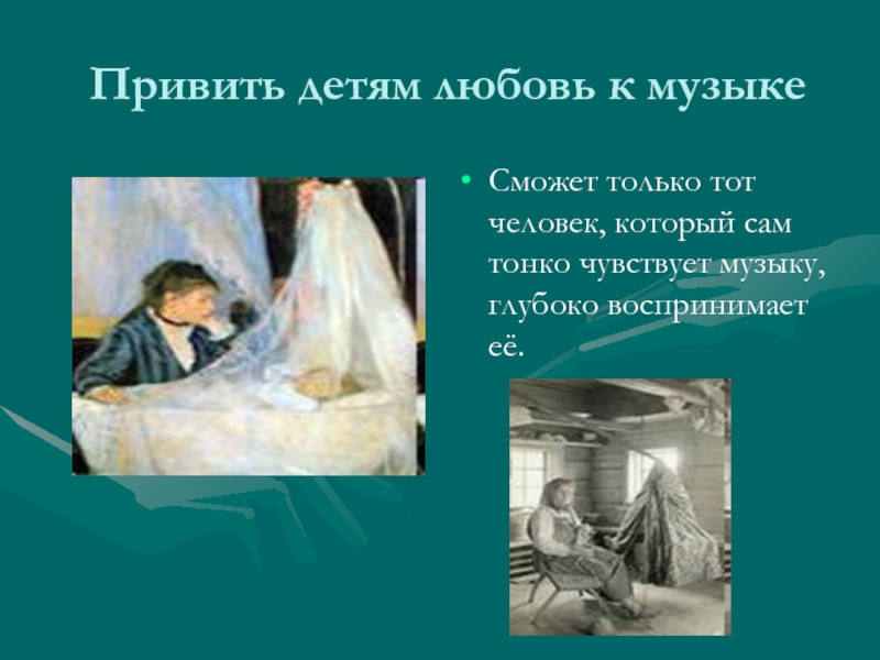 Слайд 4Благотворность влияния семьи на развитие интереса к музыке и творческих