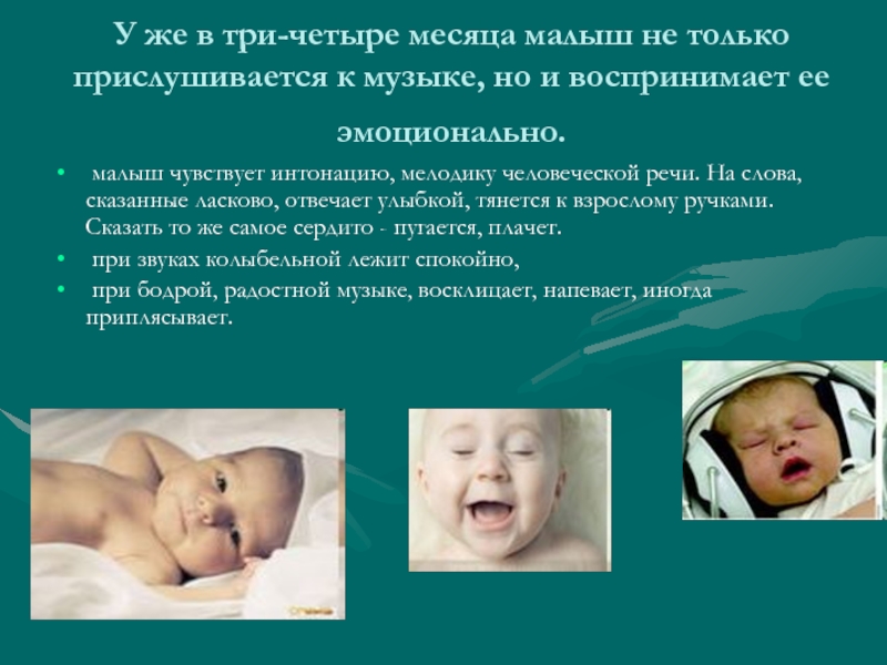 Слайд 6У же в три-четыре месяца малыш не только прислушивается к