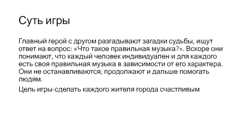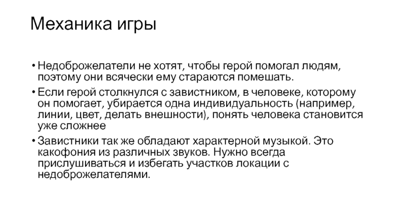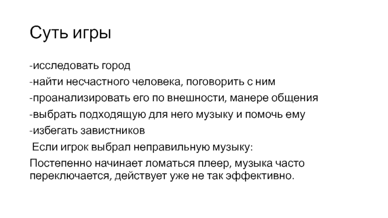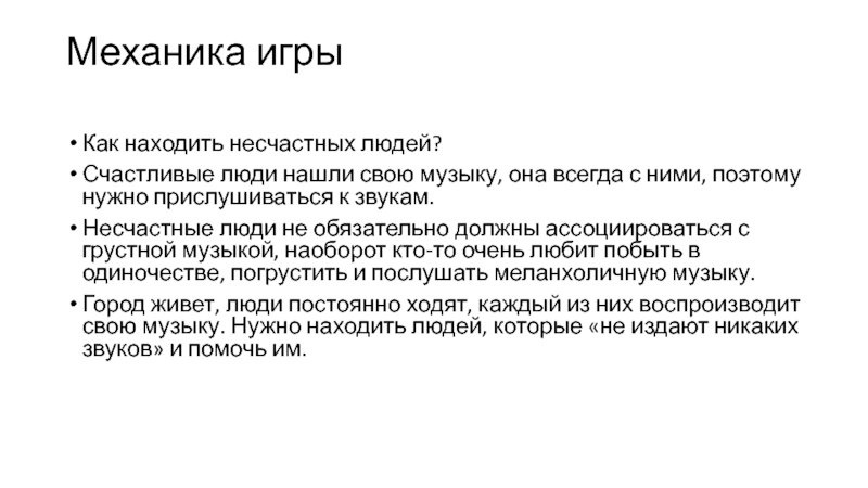 Город живет, люди постоянно ходят, каждый из них воспроизводит свою музыку. Нужно находить людей, которые «не издают никаких звуков» и помочь им.