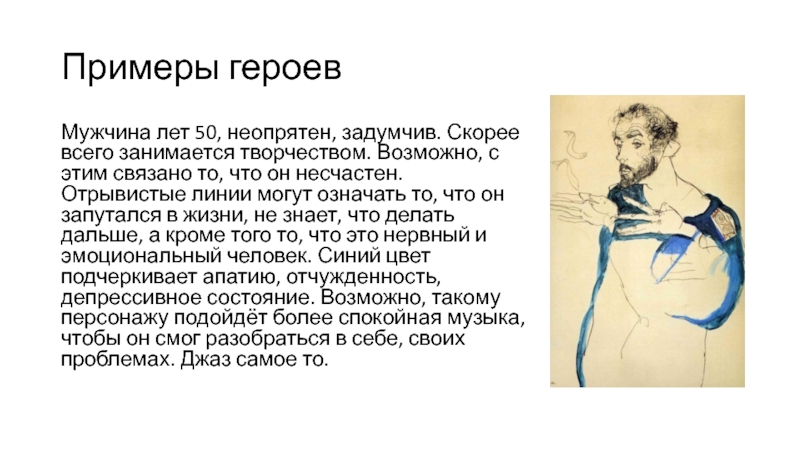 могут означать то, что он запутался в жизни, не знает, что делать дальше, а кроме того то, что это нервный и эмоциональный человек. Синий цвет подчеркивает апатию, отчужденность, депрессивное состояние. Возможно, такому персонажу подойдёт более спокойная музыка, чтобы он смог разобраться в себе, своих проблемах. Джаз самое то.