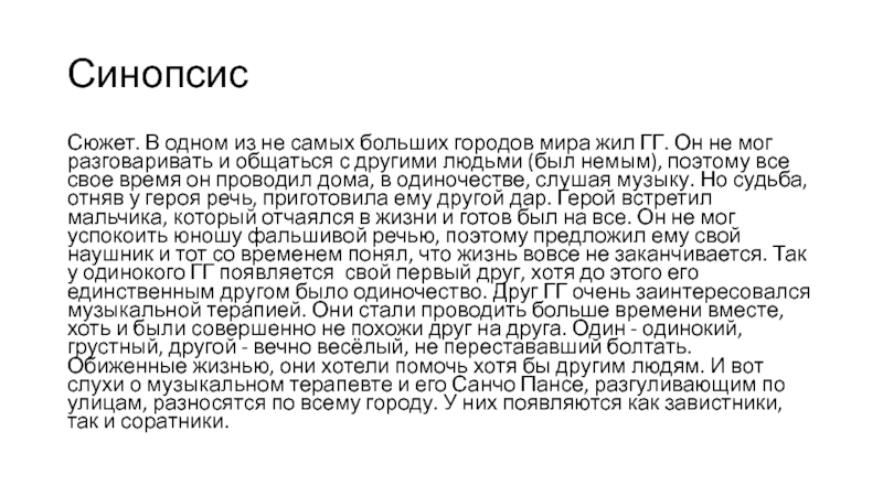 (был немым), поэтому все свое время он проводил дома, в одиночестве, слушая музыку. Но судьба, отняв у героя речь, приготовила ему другой дар. Герой встретил мальчика, который отчаялся в жизни и готов был на все. Он не мог успокоить юношу фальшивой речью, поэтому предложил ему свой наушник и тот со временем понял, что жизнь вовсе не заканчивается. Так у одинокого ГГ появляется свой первый друг, хотя до этого его единственным другом было одиночество. Друг ГГ очень заинтересовался музыкальной терапией. Они стали проводить больше времени вместе, хоть и были совершенно не похожи друг на друга. Один - одинокий, грустный, другой - вечно весёлый, не перестававший болтать. Обиженные жизнью, они хотели помочь хотя бы другим людям. И вот слухи о музыкальном терапевте и его Санчо Пансе, разгуливающим по улицам, разносятся по всему городу. У них появляются как завистники, так и соратники.