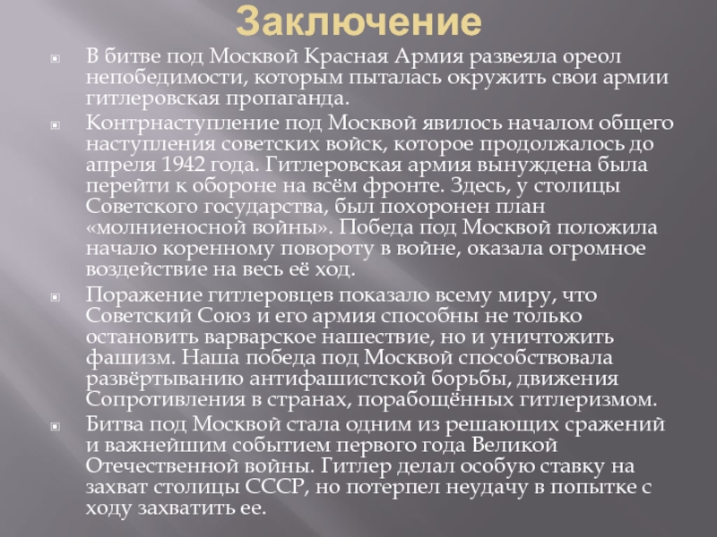 Заключение В битве под Москвой Красная Армия развеяла ореол непобедимости, которым пыталась окружить свои армии гитлеровская пропаганда.