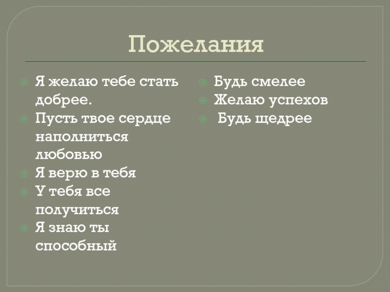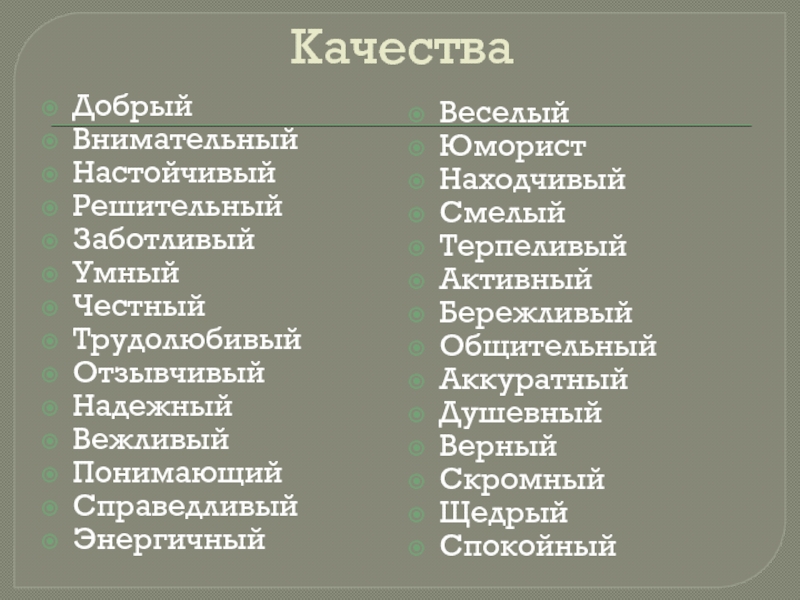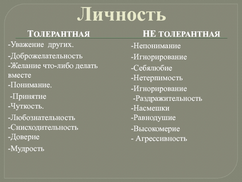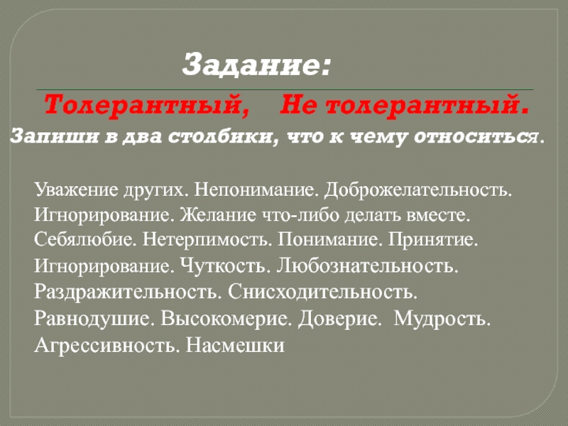 Уважение других. Непонимание. Доброжелательность. Игнорирование. Желание что-либо делать вместе. Себялюбие. Нетерпимость. Понимание. Принятие. Игнорирование. Чуткость. Любознательность. Раздражительность. Снисходительность. Равнодушие. Высокомерие. Доверие. Мудрость. Агрессивность. Насмешки