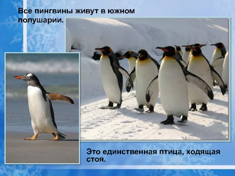 Все пингвины живут в южном полушарии.Это единственная птица, ходящая стоя.