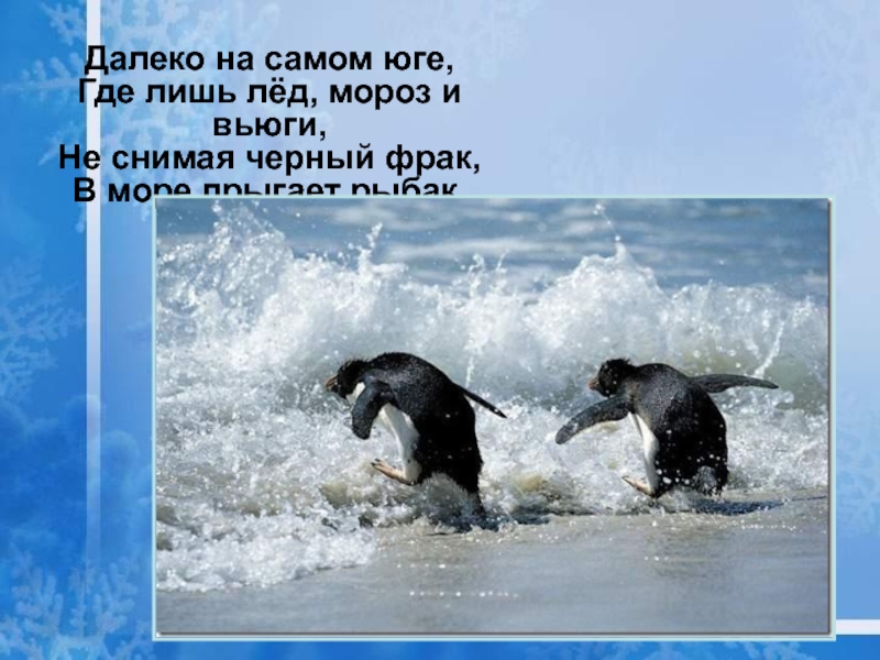 Далеко на самом юге, Где лишь лёд, мороз и вьюги, Не снимая черный фрак, В море прыгает рыбак.