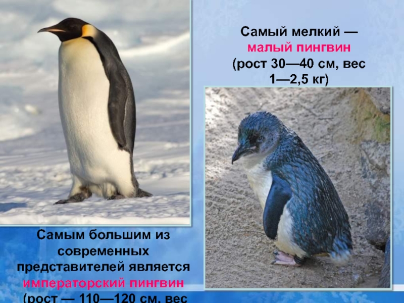 Самым большим из современных представителей является императорский пингвин (рост — 110—120 см, вес до 46 кг).Самый мелкий —малый пингвин(рост 30—40 см,
