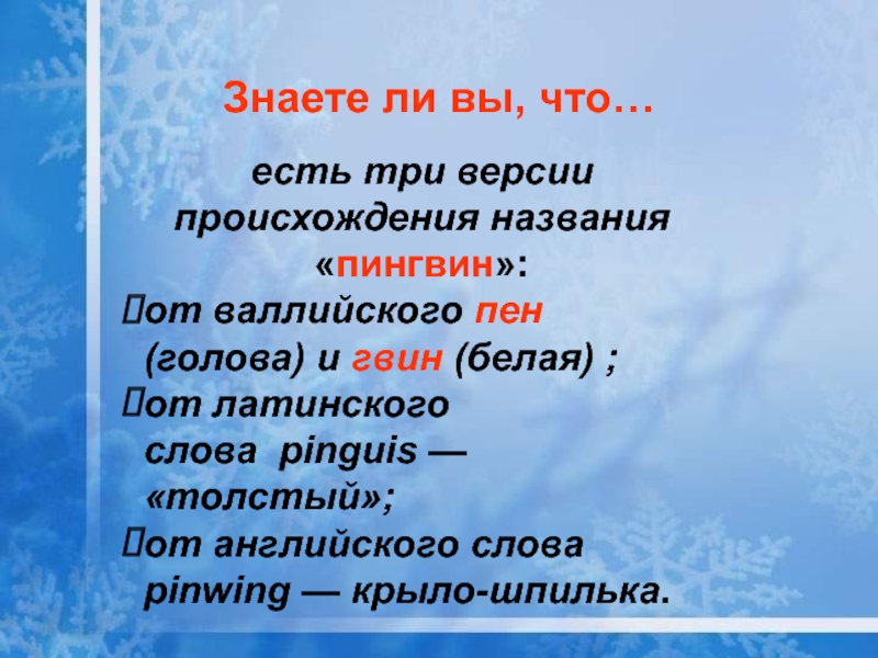 Знаете ли вы, что…есть три версии происхождения названия«пингвин»: от валлийского пен (голова) и гвин (белая) ;от латинского