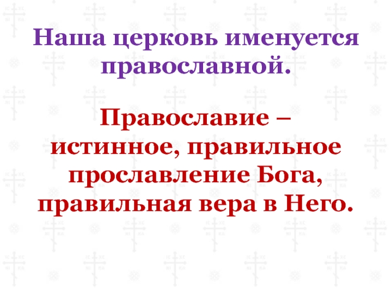 Наша церковь именуется православной.Православие –истинное, правильное прославление Бога, правильная вера в Него.