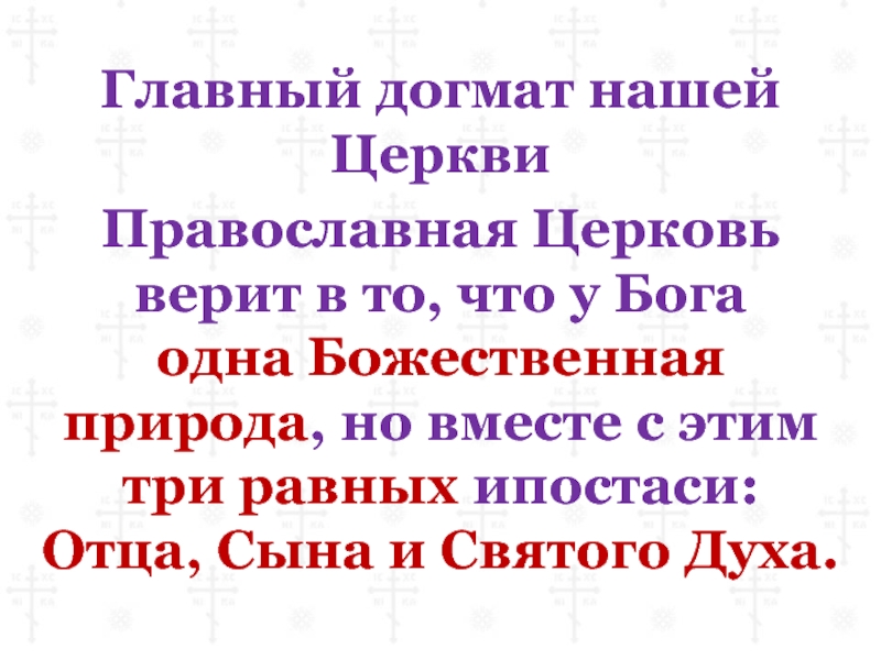 Главный догмат нашей ЦерквиПравославная Церковь верит в то, что у Богаодна Божественная природа, но вместе с этимтри