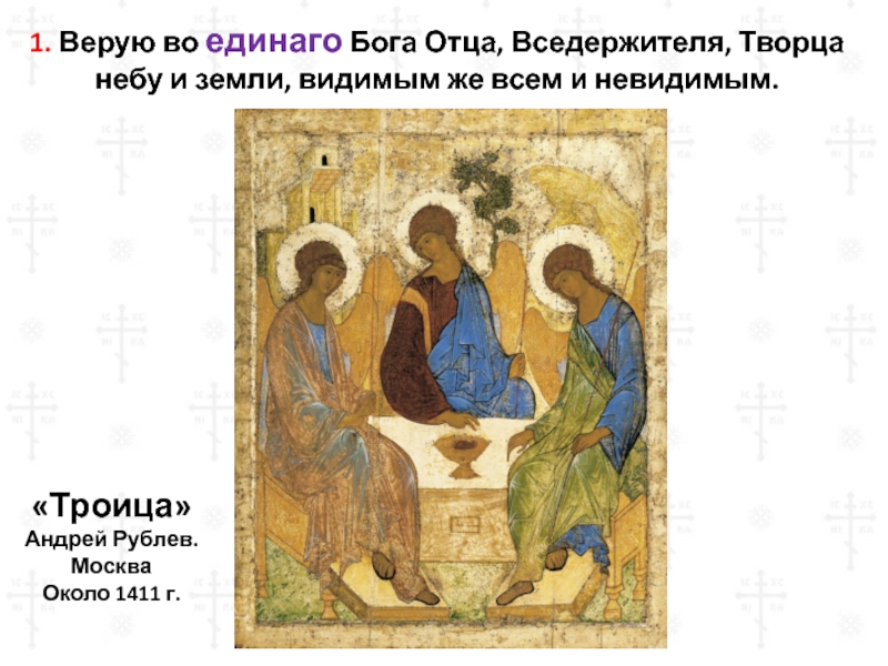 1. Верую во единаго Бога Отца, Вседержителя, Творцанебу и земли, видимым же всем и невидимым.«Троица»Андрей Рублев. Москва