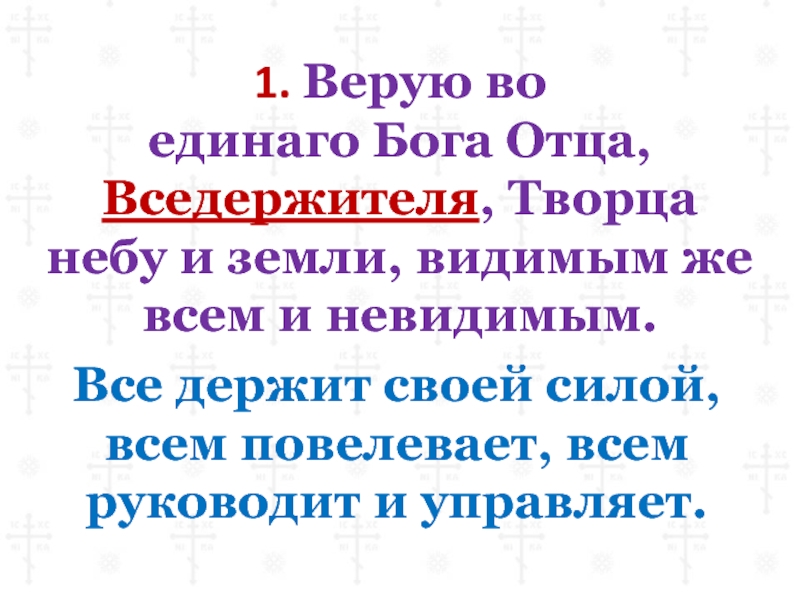 1. Верую воединаго Бога Отца, Вседержителя, Творцанебу и земли, видимым же всем и невидимым.Все держит своей силой,