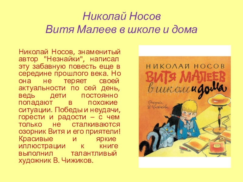 Но она не теряет своей актуальности по сей день, ведь дети постоянно попадают в похожие ситуации. Победы и неудачи, горести и радости – с чем только не сталкиваются озорник Витя и его приятели! Красивые и яркие иллюстрации к книге выполнил талантливый художник В. Чижиков.