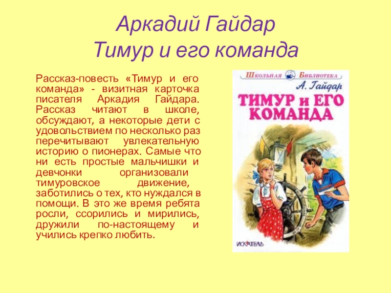 - визитная карточка писателя Аркадия Гайдара. Рассказ читают в школе,