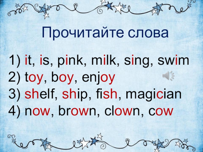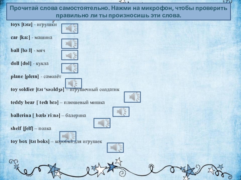 Прочитай слова самостоятельно. Нажми на микрофон, чтобы проверить правильно ли ты произносишь эти слова.