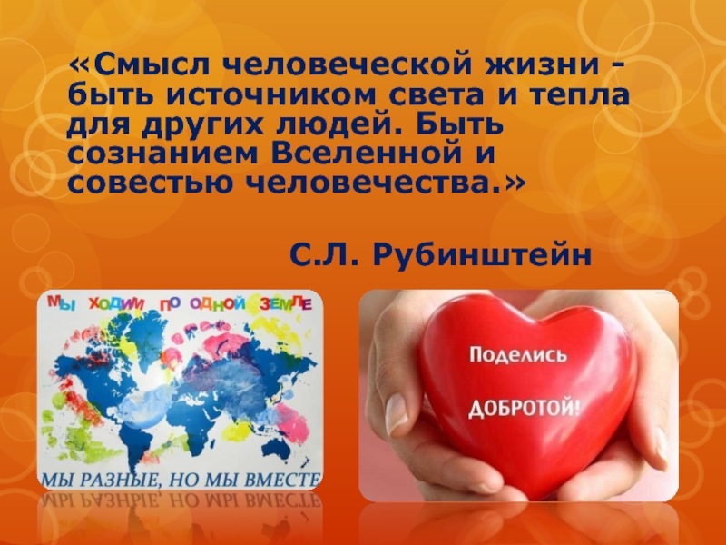 «Смысл человеческой жизни - быть источником света и тепла для других людей. Быть сознанием Вселенной и совестью человечества.»                                                                          С.Л. Рубинштейн