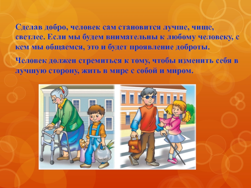 Слайд 12Сделав добро, человек сам становится лучше, чище, светлее. Если мы