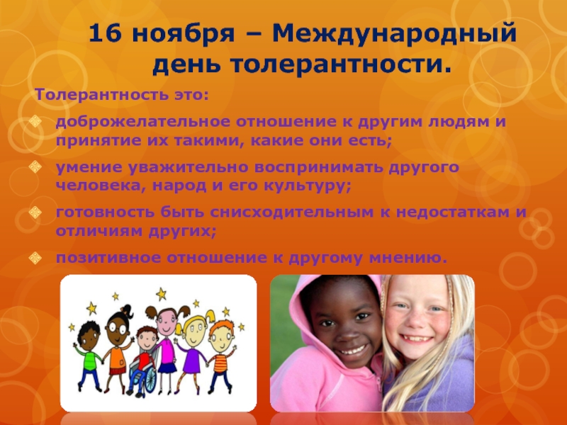 16 ноября – Международный день толерантности.  Толерантность это:доброжелательное отношение к другим людям и принятие их такими,