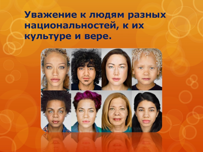 Слайд 11Уважение к людям разных национальностей, к их культуре и вере.