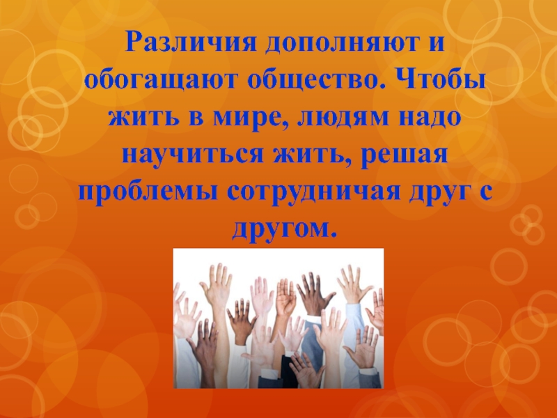 Различия дополняют и обогащают общество. Чтобы жить в мире, людям надо научиться жить, решая проблемы сотрудничая друг