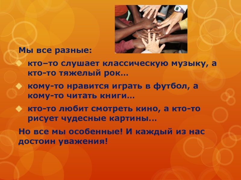 Мы все разные: кто–то слушает классическую музыку, а кто-то тяжелый рок…кому-то нравится играть в футбол, а кому-то