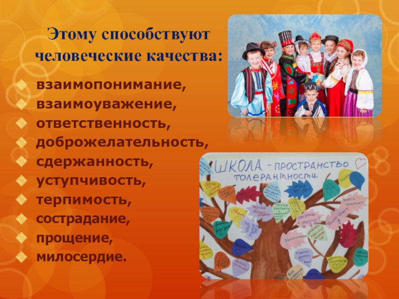 Этому способствуют человеческие качества:взаимопонимание,взаимоуважение,ответственность,доброжелательность,сдержанность, уступчивость,терпимость,сострадание,прощение,милосердие.
