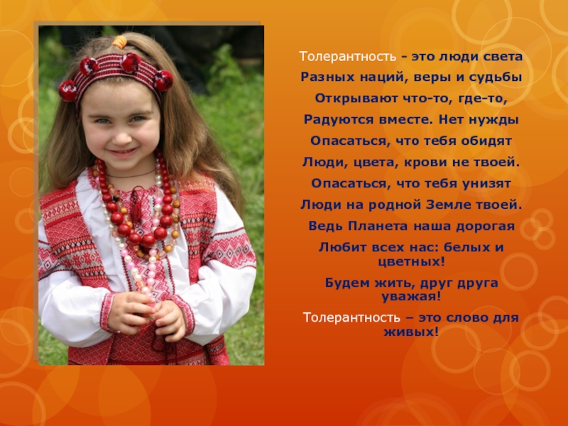 Толерантность - это люди светаРазных наций, веры и судьбыОткрывают что-то, где-то,Радуются вместе. Нет нуждыОпасаться, что тебя обидятЛюди,