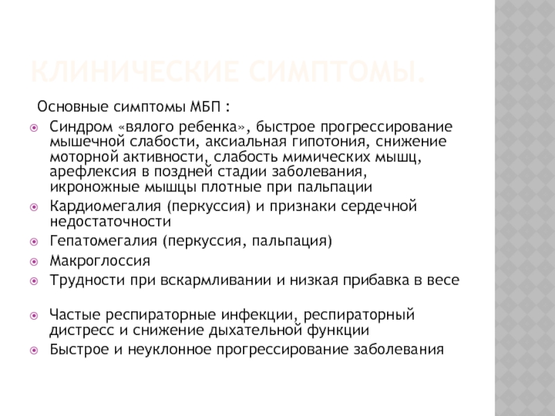 и быстрым развитием полиорганной патологии - мышечной гипотонии, слабости и сердечной недостаточности в результате гипертрофической кардиомиопатии, дыхательной недостаточности на фоне слабости диафрагмы и межреберных мышц, нарушений питания (трудности при вскармливании) из-за слабости лицевой мускулатуры и увеличения языка, увеличения печени. Смерть при МБП без своевременного лечения чаще всего наступает на первом году жизни от сердечно-дыхательной недостаточности.