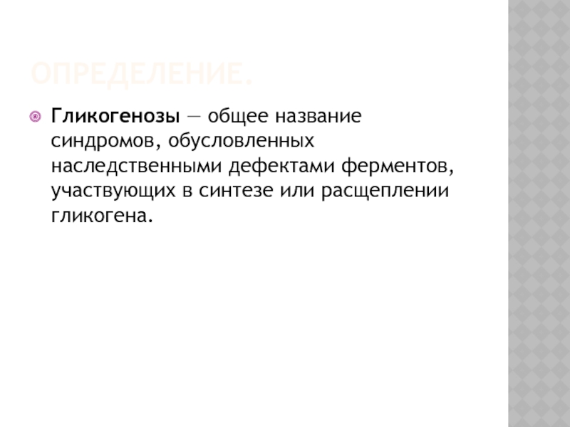 Гликогенозы — общее название синдромов, обусловленных наследственными дефектами ферментов, участвующих в