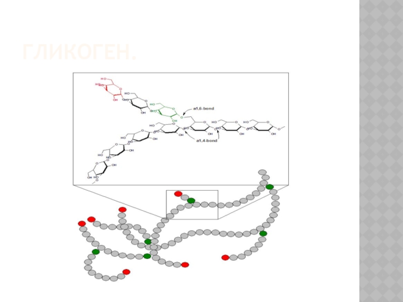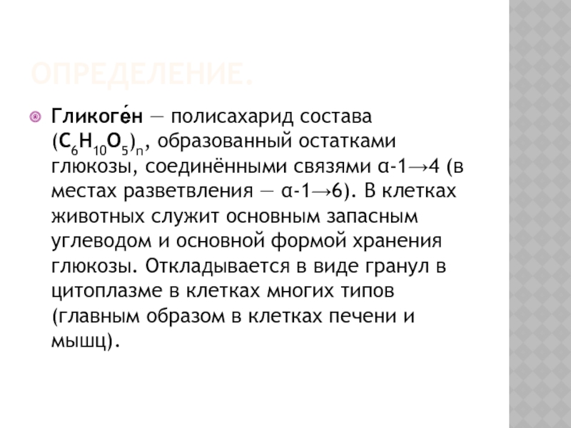 Гликоге́н — полисахарид состава (C6H10O5)n, образованный остатками глюкозы, соединёнными связями α-1→4