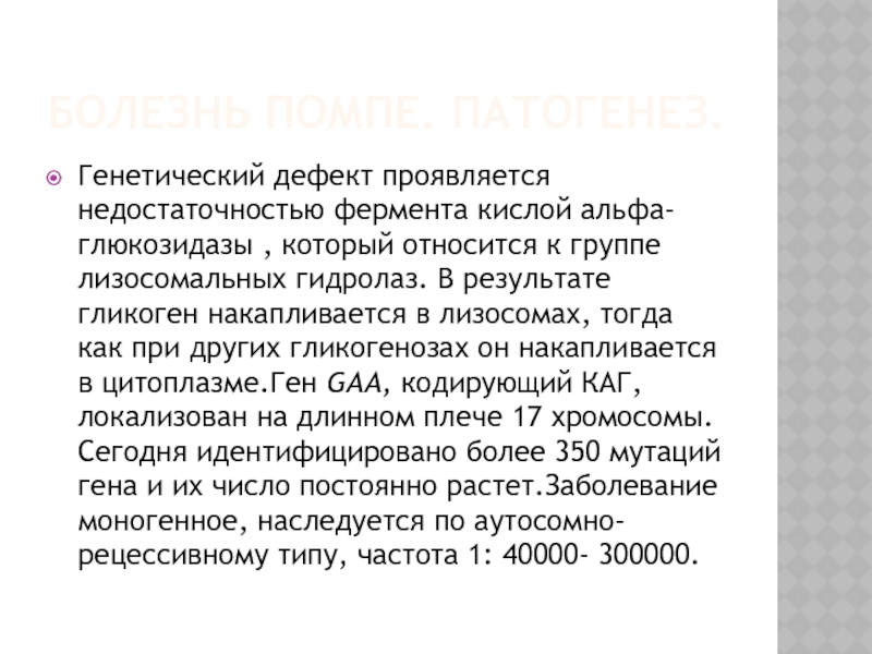 в лизосомах, тогда как при других гликогенозах он накапливается в цитоплазме.Ген GAA, кодирующий КАГ, локализован на длинном плече 17 хромосомы. Сегодня идентифицировано более 350 мутаций гена и их число постоянно растет.Заболевание моногенное, наследуется по аутосомно-рецессивному типу, частота 1: 40000- 300000.