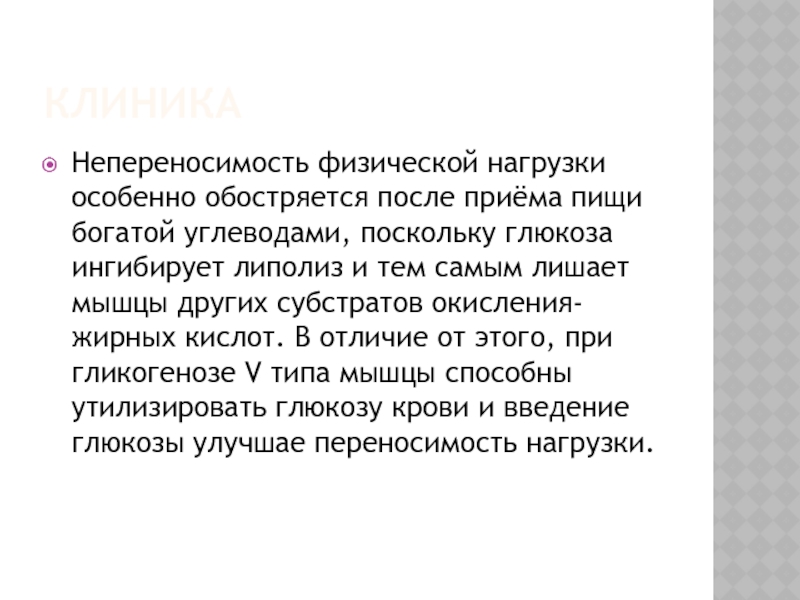 субстратов окисления- жирных кислот. В отличие от этого, при гликогенозе V типа мышцы способны утилизировать глюкозу крови и введение глюкозы улучшае переносимость нагрузки.