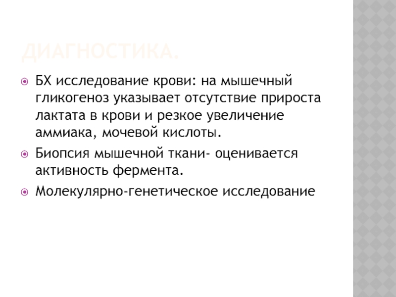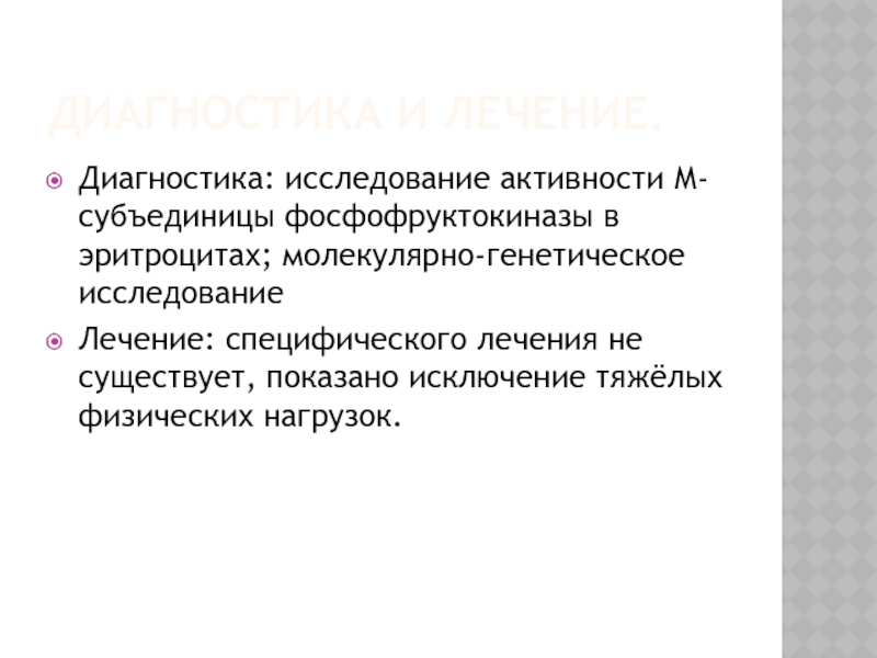 Диагностика: исследование активности М-субъединицы фосфофруктокиназы в эритроцитах; молекулярно-генетическое