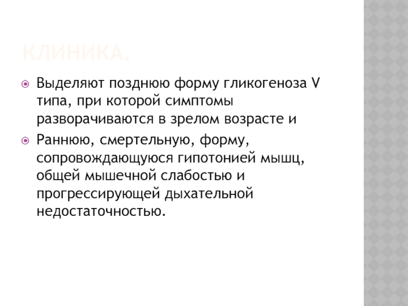 Выделяют позднюю форму гликогеноза V типа, при которой симптомы разворачиваются