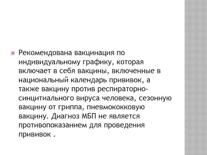 вируса человека, сезонную вакцину от гриппа, пневмококковую вакцину. Диагноз МБП не является противопоказанием для проведения прививок .