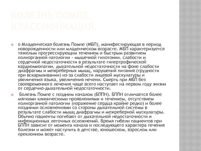 Болезнь Помпе с поздним началом (БППН). БППН отличается более мягкими клиническими проявлениями и течением, отсутствием полиорганной патологии (поражение сердца крайне редко) и более поздними осложнениями со стороны дыхательной системы в результате слабости мышц диафрагмы и межреберной мускулатуры. Обычно пациенты погибают от дыхательной недостаточности и инфекционных легочных осложнений. Время гибели пациентов при БППН зависит от момента начала и последующего характера течения болезни и может наступить в детстве, юношеском, взрослом или преклонном возрасте.