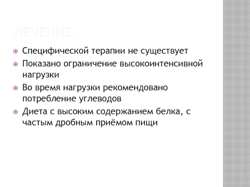 Непереносимость физической нагрузки особенно обостряется после приёма пищи богатой углеводами,