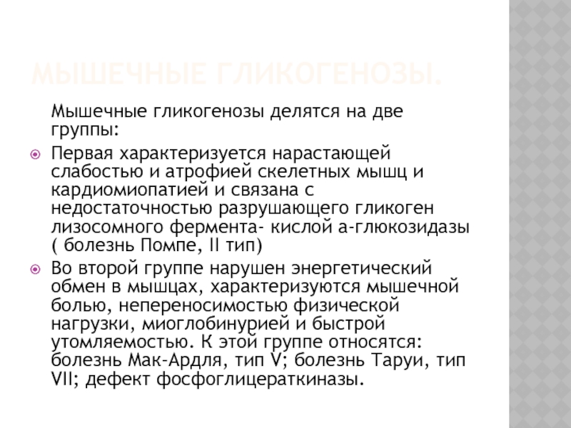 Мышечные гликогенозы делятся на две группы: